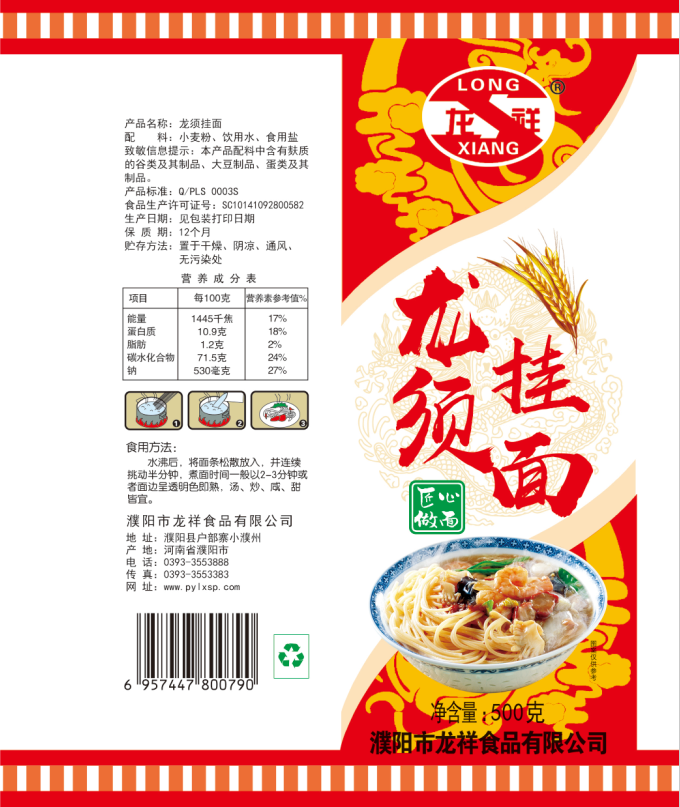 濮陽市龍祥食品有限公司位于河南省濮陽縣戶部寨鎮(zhèn)小濮州,始建于1994年,前期投資200萬元,經(jīng)過幾年的努力,大力開發(fā)市場,由于市場的需求量急劇上升,出現(xiàn)供不應(yīng)求,于2004年擴(kuò)建,建成一座新型的現(xiàn)代化面粉加工企業(yè),并擁有全國先進(jìn)全自動生產(chǎn)設(shè)備一套,產(chǎn)量由以前的100噸/天,提高到現(xiàn)在400噸/天。 2012年再次擴(kuò)大規(guī)模申請為濮陽市龍祥食品有限公司,注冊資金500萬元。2012年又投資800萬元新建掛面生產(chǎn)線一條,日產(chǎn)掛面50噸。龍祥食品有限公司現(xiàn)有職工120余人,總工程師1人,專業(yè)技術(shù)人員10人,經(jīng)濟(jì)師1人,會計(jì)師1人,銷售人員2人,優(yōu)秀專業(yè)人員20余人。 龍祥公司自創(chuàng)建以來,社會效益十分可觀。公司一直以“今天的質(zhì)量,明天的市場”為信念,“一切為了客戶需求,竭誠追求完美品質(zhì)”為企業(yè)宗旨,走專業(yè)化經(jīng)營和職業(yè)化管理的路子。